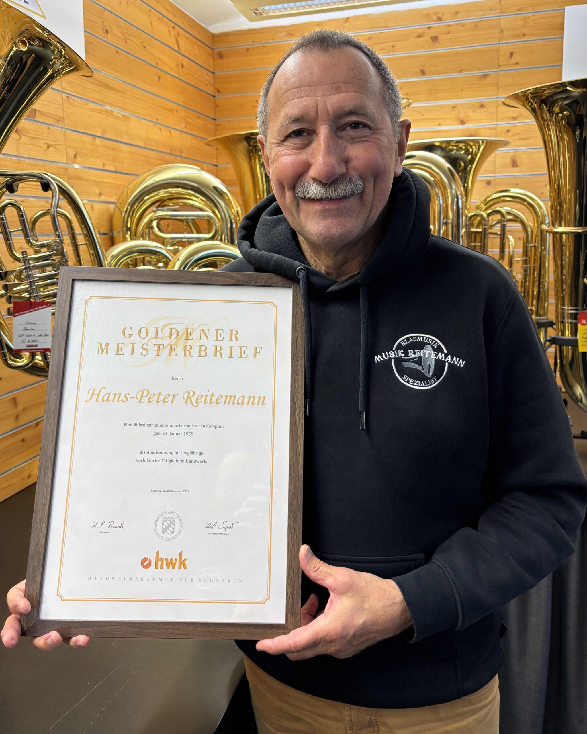 Die Handwerkskammer Schwaben hat unserem Firmenchef Peter Reitemann den Goldenen Meistertitel verliehen. Diese besondere Auszeichnung würdigt die jahrzehntelange Hingabe und exzellente Arbeit im Metallblasinstrumenten- und Schlagzeugmacherhandwerk.
